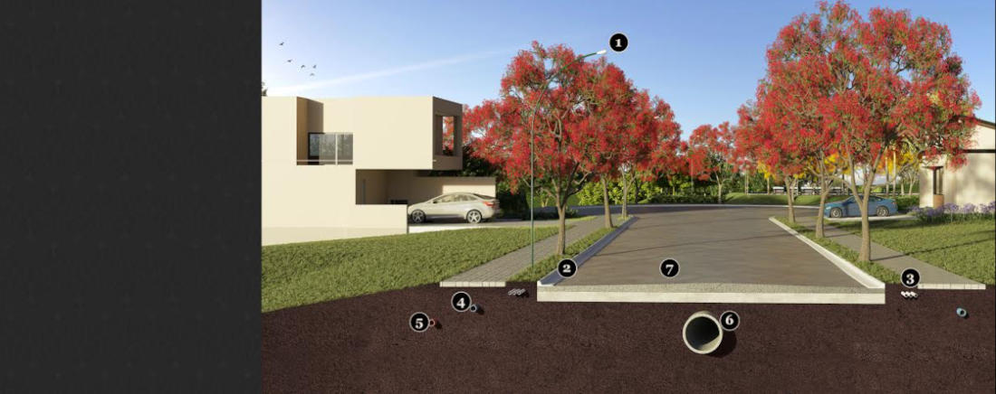 1. ILUMINAÇÃO - 2. GUIAS AMERICANAS - 3. REDE ELÉTRICA SUBTERRÃNEA - 4. REDE DE ÁGUA - 5. REDE DE ESGOTO - 6. GALERIA DE ÁGUAS PLUVIAIS - 7. PAVIMENTAÇÃO